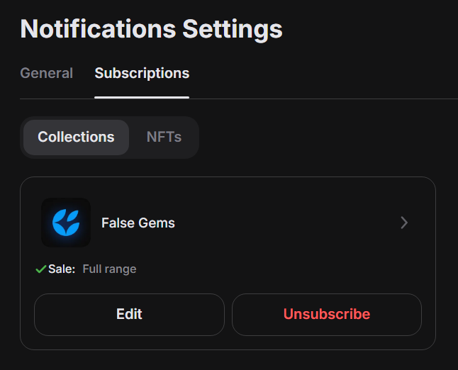 - In the Notification Settings, go to "Subscriptions" – there you can switch between collections and individual NFTs, edit settings, or unsubscribe from specific NFTs.