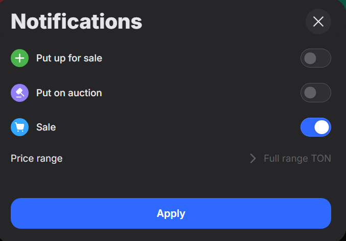 - After setting the parameters, click "Apply". A checkmark indicating subscription to notifications about the NFT will appear on the bell icon.