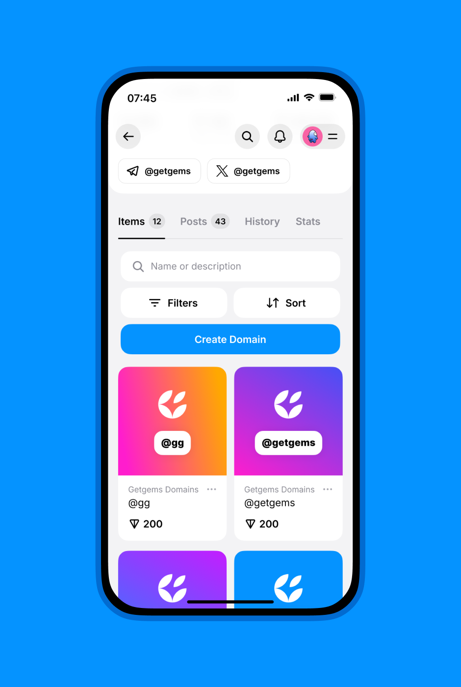 Getgems offers a special feature where you can create a stunning short link for your profile or collection, such as https://getgems.io/beautiful_domain.