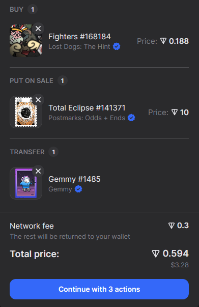 After adding the desired NFTs, click the "Continue" button and sign the transaction: