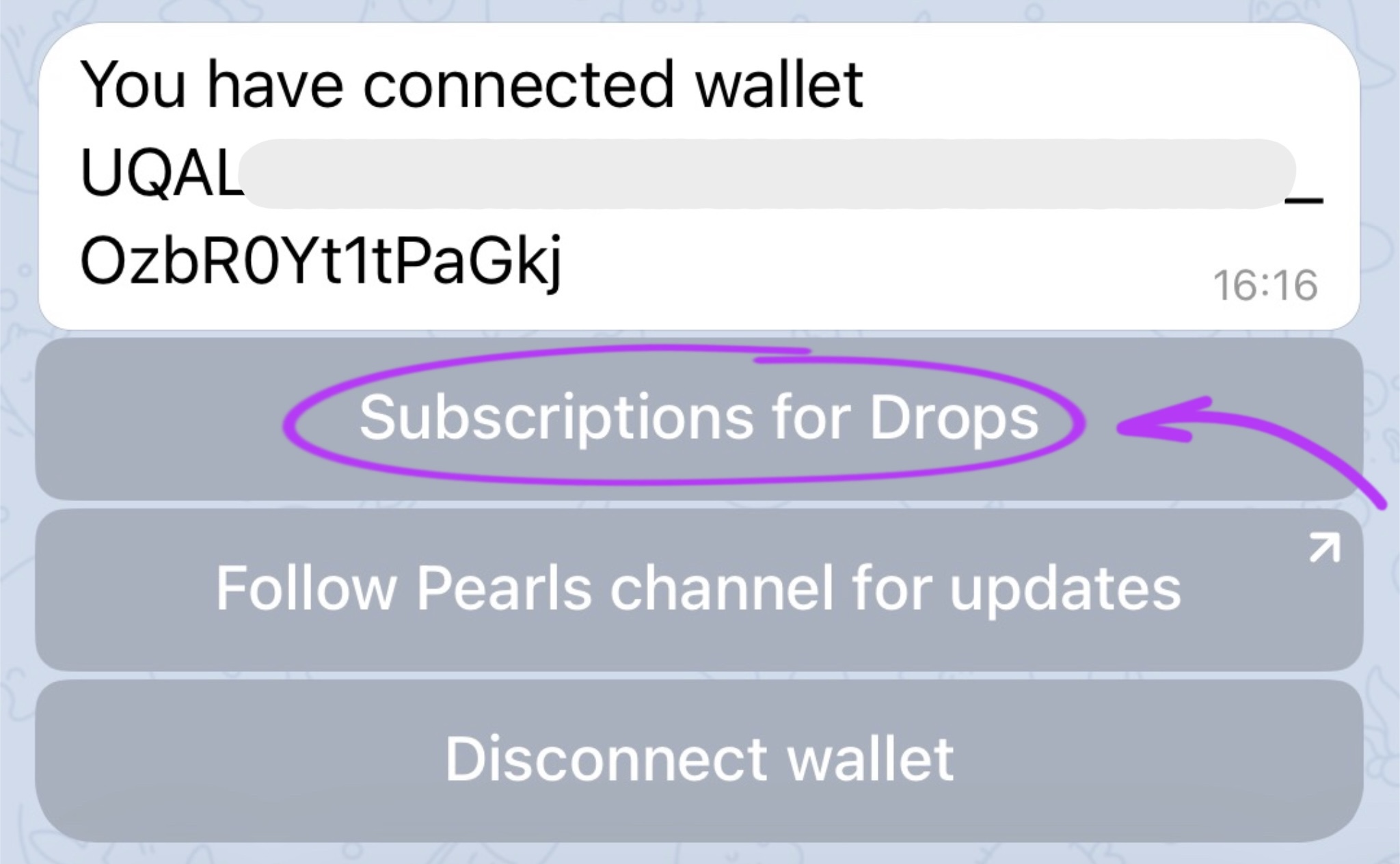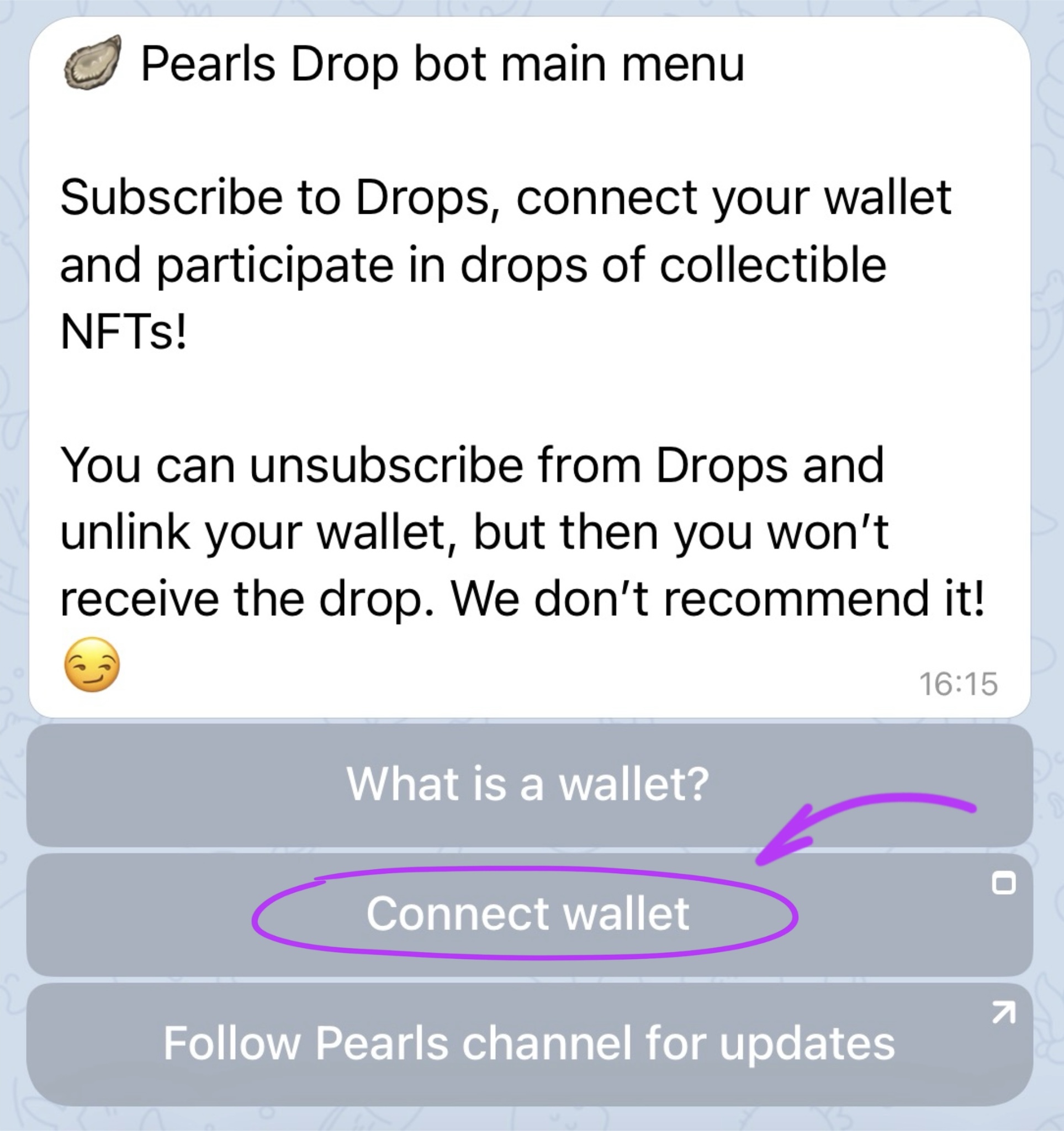 1. Visit the bot at https://t.me/pearls_drop_bot.
