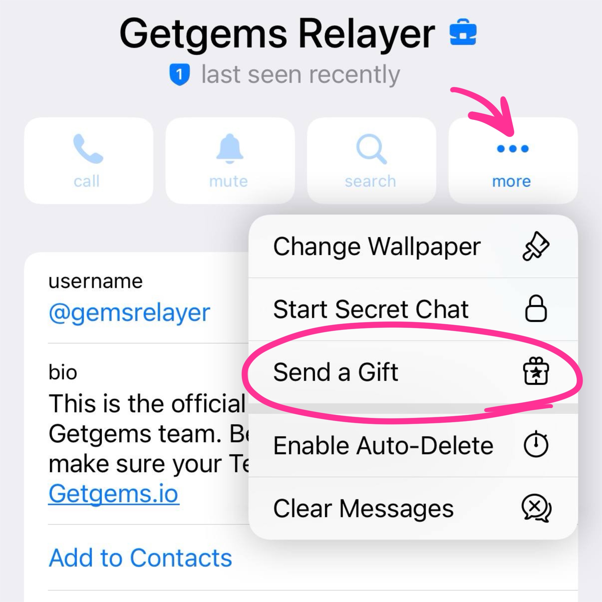 2. Then, go to the @gemsrelayer bot’s account → Click the three dots → Select 'Send a Gift'.