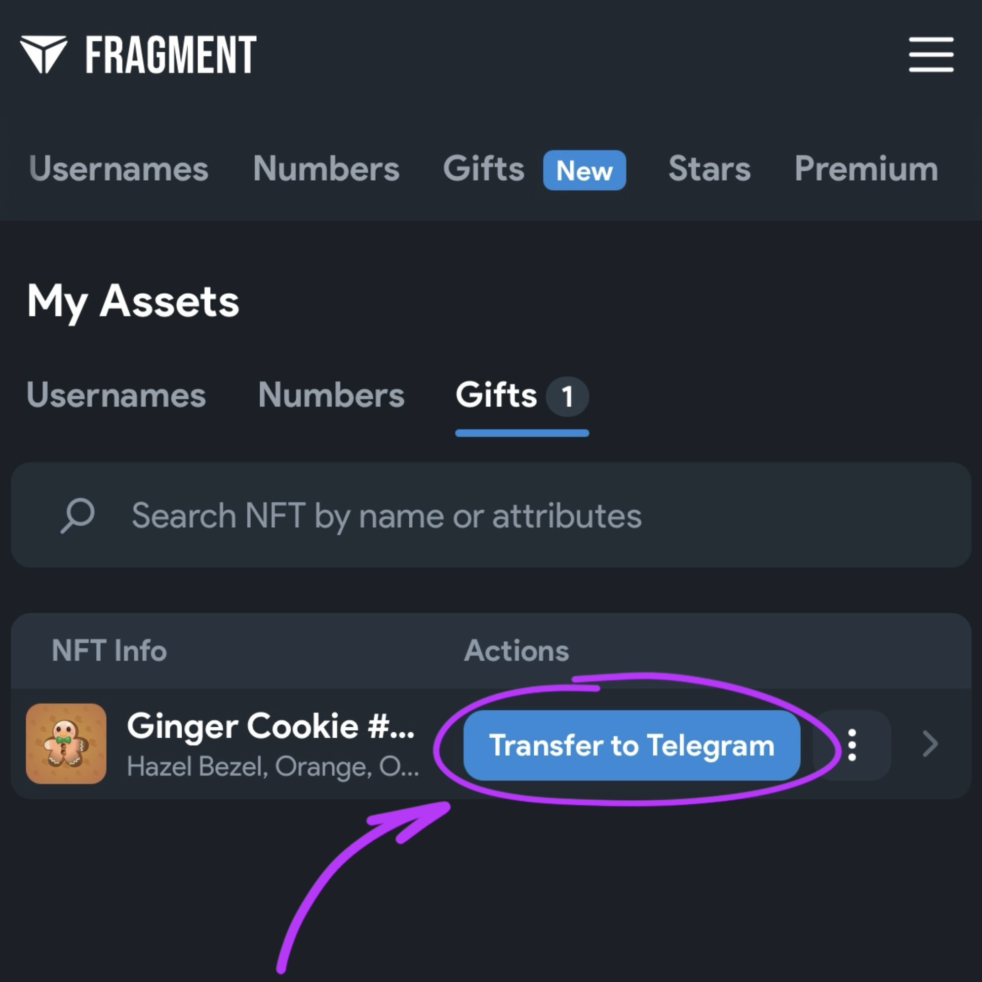 - Choose the desired gift and click the “Transfer to Telegram” button.