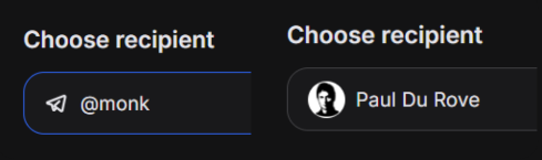 - Enter the Telegram username of the account that will receive the TON. Once the username is successfully entered, their avatar and username will be displayed.