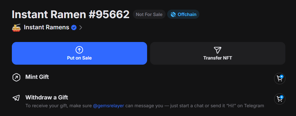 After a successful transaction, the gift will no longer have the "Offchain" label on Getgems and will be added to your wallet.